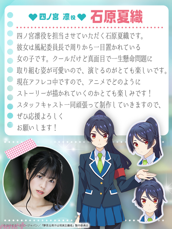 四ノ宮凛役を担当させていただく石原夏織です。彼女は風紀委員長で周りから一目置かれている女の子です。クールだけど真面目で一生懸命問題に取り組む姿が可愛いので、演じるのがとても楽しいです。