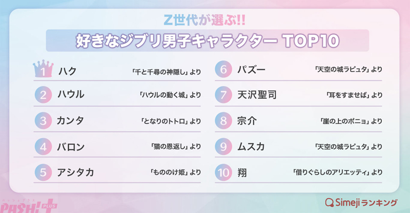 バイドゥが提供する日本語入力&きせかえ顔文字キーボードアプリ“Simeji”は、Simejiユーザーへアプリ上でアンケート調査を実施。“Z世代が選ぶ!! 「好きなジブリ男子キャラクターTOP10」”を発表しました。