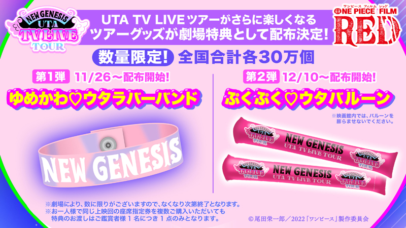 そして、“UTA TV LIVE TOUR”に合わせて、映画をご鑑賞いただいたお客様にツアーグッズを配布。11月26日から配布開始となる第1弾ツアーグッズは、“ゆめかわ♡ウタラバーバンド”。ピンクとパープルのマーブル模様はウタの世界観にぴったりです!