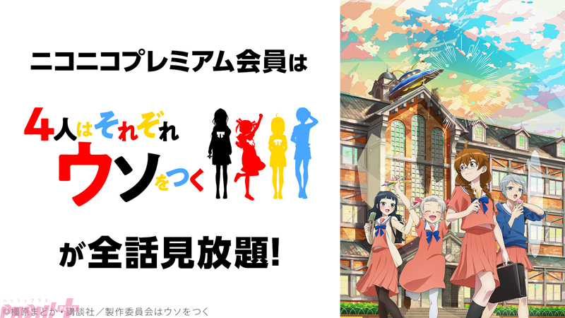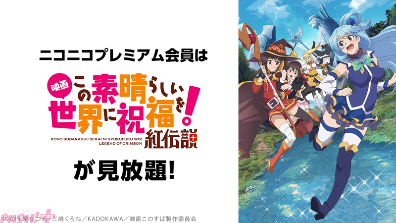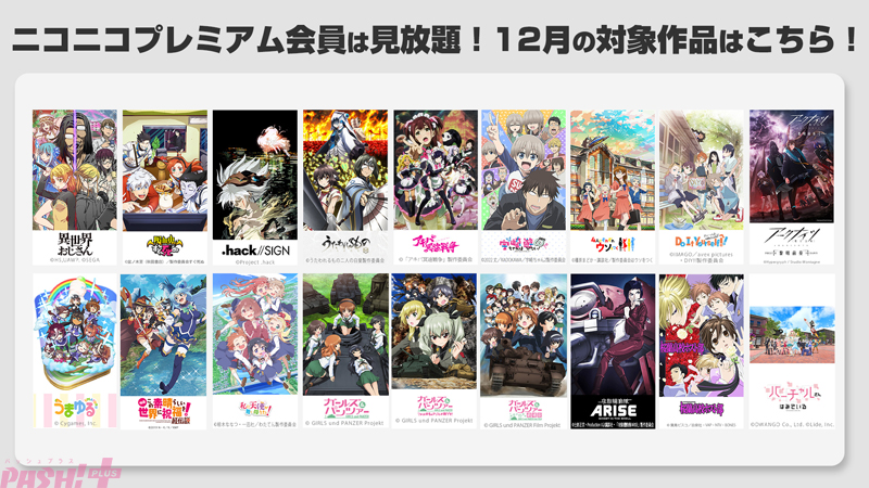 12月から『異世界おじさん』、『吸血鬼すぐ死ぬ』、『.hack//SIGN』、11月から引き続き『うたわれるもの 二人の白皇』、『アキバ冥途戦争』、『宇崎ちゃんは遊びたい!ω』、『4人はそれぞれウソをつく』、『Do It Yourself!! -どぅー・いっと・ゆあせるふ-』、『アークナイツ【黎明前奏/PRELUDE TO DAWN】』、『うまゆる』、『映画 この素晴らしい世界に祝福を!紅伝説』、『私に天使が舞い降りた!』、『ガールズ&パンツァー』、『ガールズ&パンツァー これが本当のアンツィオ戦です!』、『ガールズ&パンツァー 劇場版』、『攻殻機動隊ARISE』、『桜蘭高校ホスト部』、『バーチャルさんはみている』のアニメ18作品と、『後宮の烏』のニコニコ生放送特番のニコニコプレミアム会員見放題を行います。