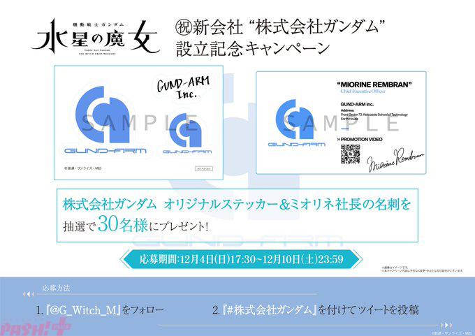 お祝いや応援のメッセージをお送りください!抽選で30名様に、会社ロゴステッカー&ミオリネ社長の名刺をプレゼント!#水星の魔女 #G_Witch pic.twitter.com/TfsUsb07h6