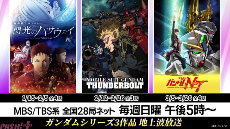 バンダイナムコグループの横断プロジェクト“ガンダムプロジェクト”と、バンダイナムコフィルムワークスは、2023年1月より放送を開始するガンダムシリーズ3作品『機動戦士ガンダム閃光のハサウェイ』、『機動戦士ガンダム サンダーボルト』、『機動戦士ガンダムNT』、並びにTVアニメーション最新作『機動戦士ガンダム 水星の魔女』の放送情報を公開しています。 10月2日より地上波放送展開“GUNDAM NEXT FUTURE×日5”として、MBS/TBS系全国28局ネットの“日5”枠にて放送中の『機動戦士ガンダム 水星の魔女』に続き、1月15日より同枠にてガンダムシリーズの原点となる“宇宙世紀”を舞台にした3作品、『機動戦士ガンダム 閃光のハサウェイ』(劇場作品)、『機動戦士ガンダムサンダーボルト』(OVA)、『機動戦士ガンダムNT(ナラティブ)』(劇場作品)がTVエディションとして、順次放送開始いたします。 1月15日より『機動戦士ガンダム 閃光のハサウェイ』が全4話、2月12日より『機動戦士ガンダム サンダーボルト』が全3話、3月5日より『機動戦士ガンダムNT』が全4話で放送予定になります。 1月から放送予定の3作品は、ガンダムシリーズの原点となる『機動戦士ガンダム』から続く“宇宙世紀”を舞台に、ガンダムシリーズのより奥深い側面もお楽しみいただける作品となっています。 また、“日5”枠にて放送中の『機動戦士ガンダム 水星の魔女』は、12月30日よりBS11ガンダムアワーでも19:00から放送を開始いたします。さらに、2023年1月6日より、MBS・TBS“アニメイズム”枠にて、毎週金曜深夜2:25からのアンコール放送も決定しています。 【宇宙世紀3作品TVエディション放送情報】 ■毎週日曜17:00~ MBS/TBS 系全国28局ネットにて放送 『機動戦士ガンダム 閃光のハサウェイ』TVエディション(全4話):1月15日、1月22日、1月29日、2月5日:日曜17:00~ 『機動戦士ガンダム サンダーボルト』TVエディション(全3話):2月12日、2月19日、2月26日:日曜17:00~ 『機動戦士ガンダムNT』TV エディション(全4話):3月5日、3月12日、3月19日、3月26日:日曜17:00~ 【『機動戦士ガンダム 水星の魔女』放送情報】 ■毎週日曜17:00~ MBS/TBS 系全国28局ネットにて放送中 12月25日日曜17:00~ 第11話「地球の魔女」放送 1月8日日曜17:00~ 第12話放送(第1クール最終回) ※第2 クールは 2023 年 4 月より放送開始 ■12月30日よりBS11 ガンダムアワー 毎週金曜19:00~放送開始 12月30日金曜19:00~ 「PROLOGUE」放送 1月6日金曜19:00~ 第1話「魔女と花嫁」放送 ■2023年1月6日より MBS日、TBS“アニメイズム”枠にて毎週金曜深夜2:25~放送開始 1月6日金曜深夜2:55~ 第1話「魔女と花嫁」放送 ※第1話は“KOBELCOスポーツスペシャル 第102回全国高校ラグビー大会ハイライト”放送のため、深夜2:55から放送いたします。 ※第2話は『金曜ドラマ』時間拡大のため、深夜2:10から放送いたします。 (C)創通・サンライズ (C)創通・サンライズ・MBS