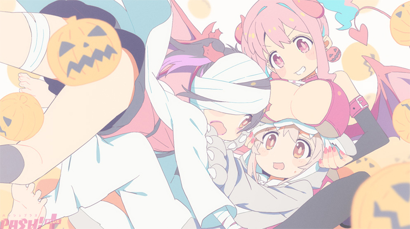 ハロウィンのコスプレ衣装で、キュートな狼の着ぐるみに身を包んだまひろ、包帯姿のユニークなコスプレのみはり、セクシーな吸血鬼に扮したかえでの3人が賑やかに集うイラストです。次回以降も豪華クリエイターのエンドカードビジュアルが解禁されますので、ぜひお楽しみください。