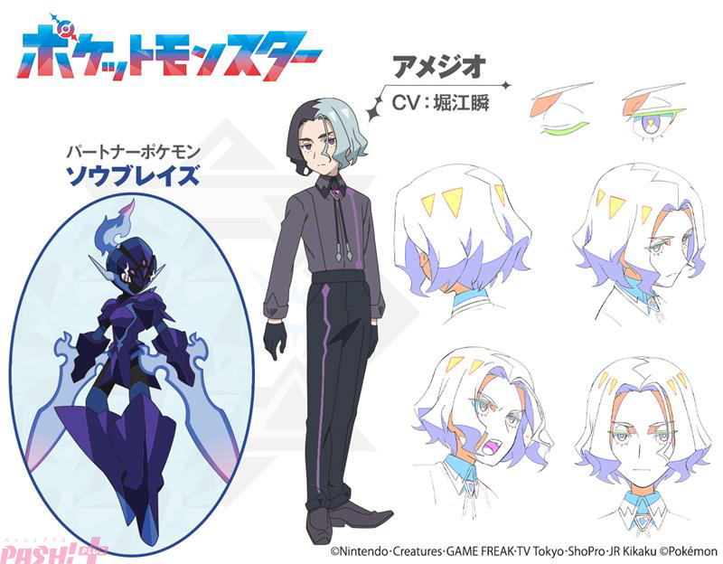 今回新たに発表になったのは、パルデア地方のポケモン、ソウブレイズがパートナーのアメジオ(声優:堀江瞬)と、アメジオが所属する組織・エクスプローラーズのメンバーであるジル(声優:田邊幸輔)とパートナーポケモンのサイドン、そしてコニア(声優:志田有彩)とパートナーポケモンのゴルダック。