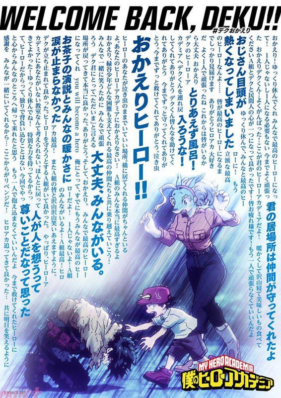 先週3月18日放送の6期第24話(通算137話)「未成年の主張」でのデクの雄英帰還を受けて、デクと1年A組に向けてヒロアカファン・視聴者からTwitterで“#デクおかえり”メッセージが募集されました。