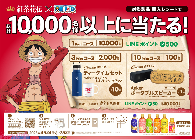 4月24日~7月2日の期間、『紅茶花伝』(エリア限定品を含む)を購入し、そのレシートを撮影し専用サイトにて応募すると、購入本数に応じて『ONE PIECE』のキャラクターが描かれたティータイムセット(全10種)や、Anker ポータブルスピーカー(ポーチ付)などが総計10,000名以上にその場で当たります。