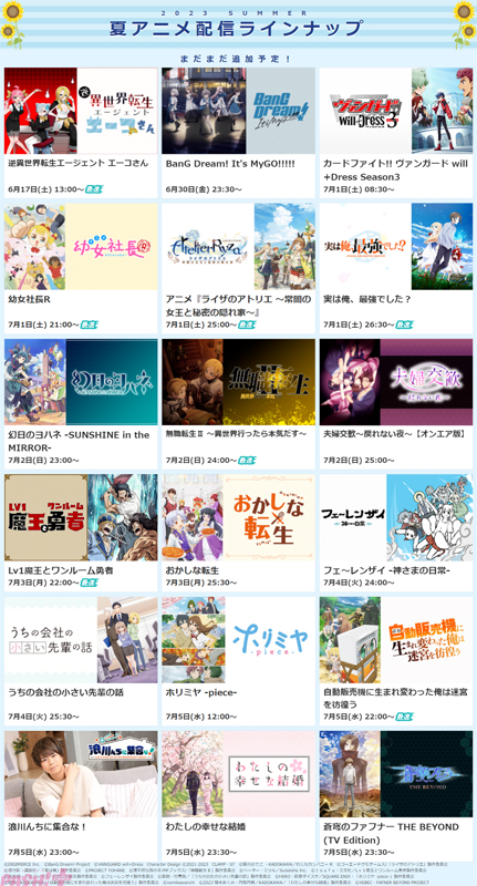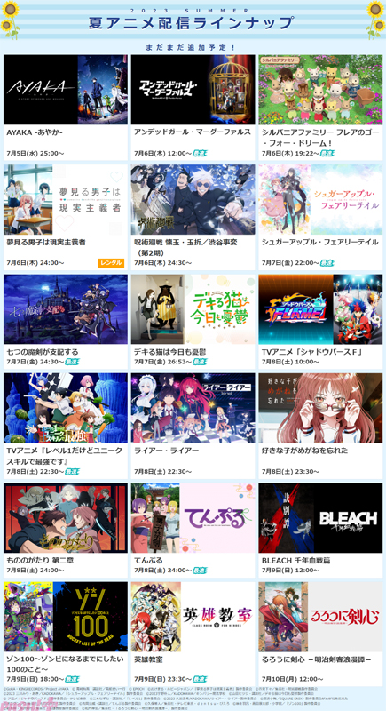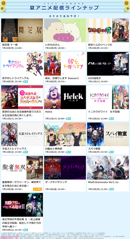 dアニメストアは、2023年夏から始まる新作アニメの配信ラインナップ(2023年4月3日現在/随時更新中)を公開しました。