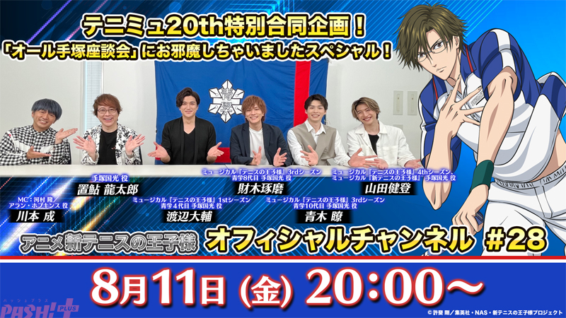 ミュージカル『テニスの王子様』20周年記念特別番組“テニミュ通信”の番組内で配信される“オール手塚座談会”にテニチャのMCである川本成さん(河村隆/アラン・ホプキンス役)とアニメで手塚国光を演じる声優の置鮎龍太郎さんがお邪魔し、『テニミュ』で手塚国光を演じた渡辺大輔さん(1stシーズン・青学4代目)、財木琢磨さん(3rdシーズン・青学8代目)、青木瞭さん(3rdシーズン・青学10代目)、山田健登さん(4thシーズン、ミュージカル『新テニスの王子様』)とトークを繰り広げます。
