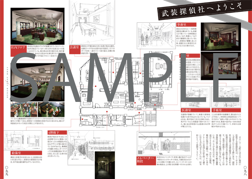 丁寧に描かれたヨコハマの街並みや、武装探偵社の内部、周辺施設の紹介など本作の世界観を掘り下げる。
