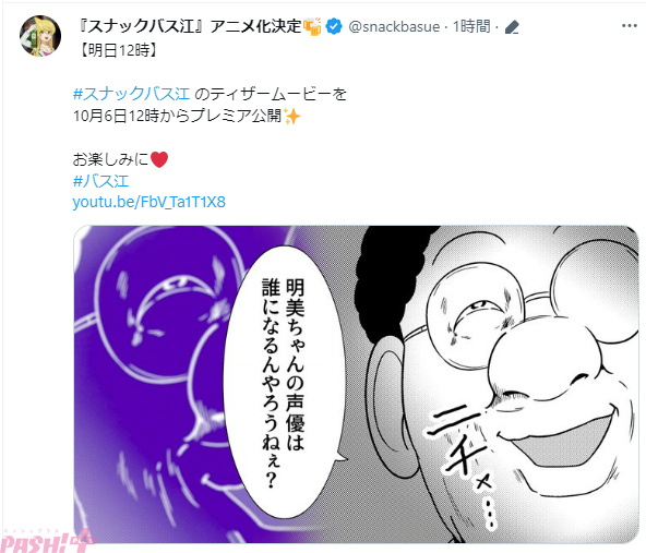 アニメ化が決定した『スナックバス江』のティザームービーが公開されました。映像では明美、バス江、森田のボイスが確認できます。