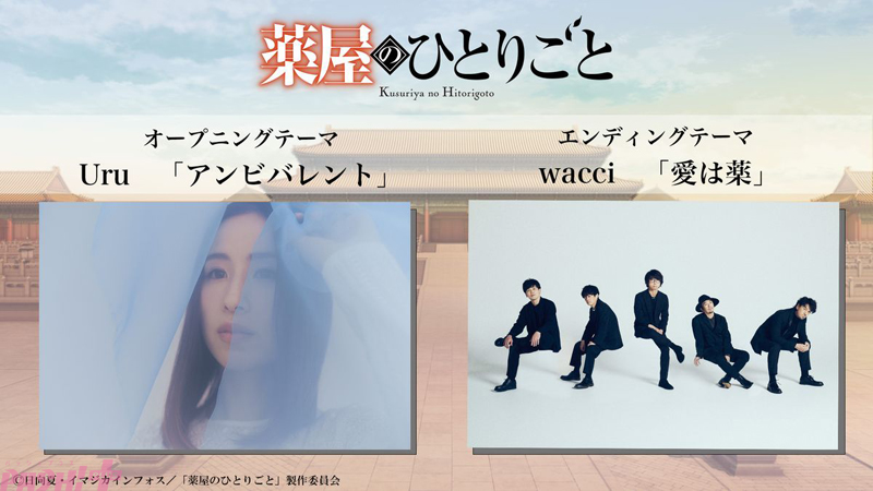 第2クールを音楽で彩るのはUruさんとwacciの2組。今回のオープニングテーマでは、Uruさんの穏やかなバラード曲のイメージから一転、さわやかできらめく世界観、そして新たな世界へと導きだしてくれる猫猫の魅力を詰めこんだ楽曲となっています。エンディングテーマ「愛は薬」では、猫猫の誰かを願う気持ち、そして猫猫を取り巻く彼女への想いなど、作品で描かれている暖かな愛をテーマに書き下ろされています。