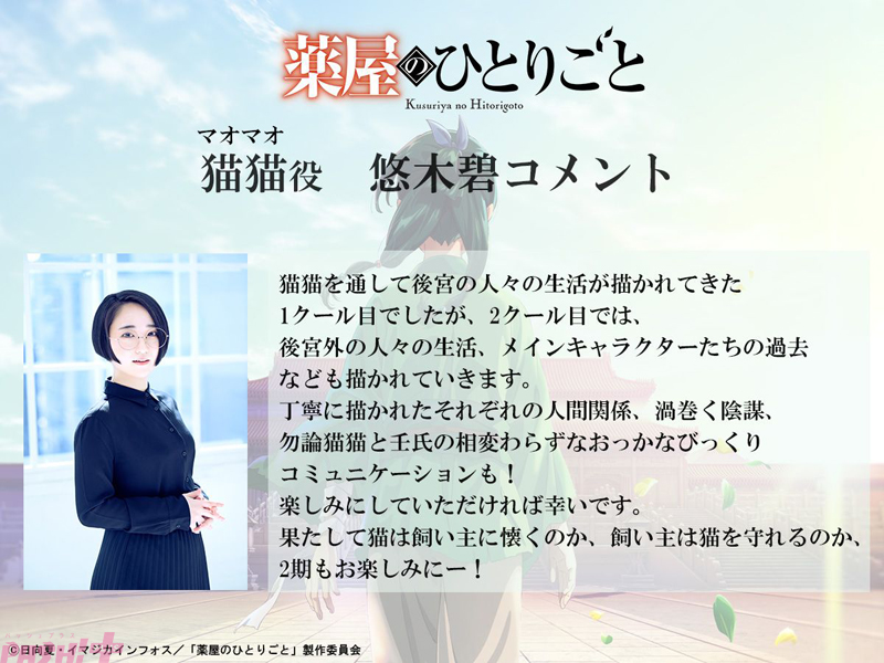 外廷で働き、薬草に詳しい長身の謎の官女・翠苓を演じるのは名塚佳織さん。その他、猫猫役の悠木碧さん、そして壬氏役の大塚剛央さんから第2クールに向けての期待コメントも到着しました。