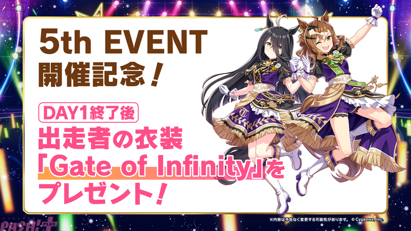 「5th EVENT ARENA TOUR GO BEYOND -NEW GATE- 」の開催を記念して、出走者が着用していた衣装「Gate of Infinity」をゲーム内でプレゼントします。3月22日(金)21:00 から配布予定です。ホームやライブシアターなどでお気に入りのウマ娘に着せてみてください! 詳細は配布時に掲載される公式サイトまたはゲーム内お知らせをご確認ください。