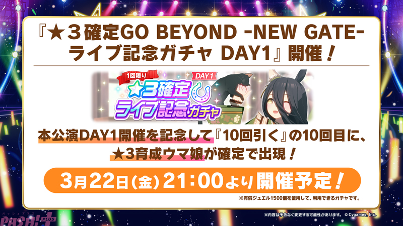 「ウマ娘 プリティーダービー 5th EVENT ARENA TOUR GO BEYOND -NEW GATE- 」DAY1の開催を記念して、1人1回限定で引ける「★3 確定 GO BEYOND -NEW GATE- ライブ記念ガチャ DAY1」を開催します。有償ジュエル 1500 個を使用して、利用できるガチャです。詳細は開催時に公開される、公式サイトまたはゲーム内お知らせをご確認ください。
