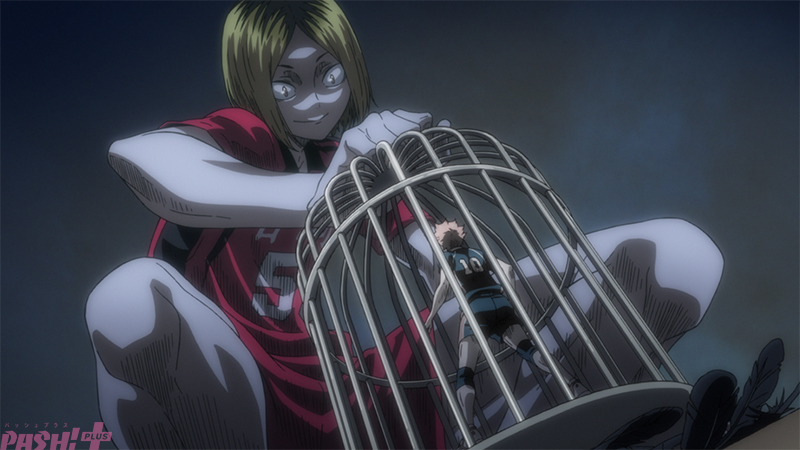 一枚目は、不敵な笑みを浮かべた研磨が鳥かごに入れられた日向を見下ろしている、不気味な迫力のあるカット。鋭い観察力と冷静な判断力を武器にチームを牽引する司令塔の研磨が、この試合でも巧みな戦術で日向と烏野バレー部を追い詰めていくことが覗えます。