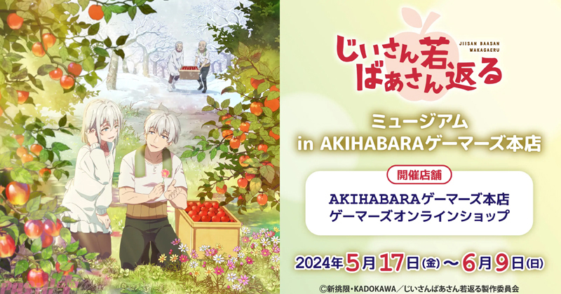 TVアニメ「じいさんばあさん若返る」ミュージアムがAKIHABARAゲーマーズ本店で開催決定。新作グッズの販売や、ここでしか手に入らない特別な景品を用意した抽選会が実施されます。その他にも、場面写真パネルなど「じいさんばあさん若返る」の世界に浸れる展示が用意されています。