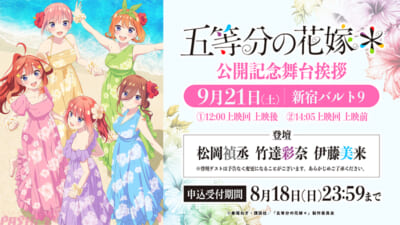 出演は上杉風太郎役の松岡禎丞さん、中野二乃役の竹達彩奈さん、中野三玖役の伊藤美来さんとなっており、日程は9月21日(土)、場所は東京・新宿バルト9にて上映後と上映前の2回行われます。