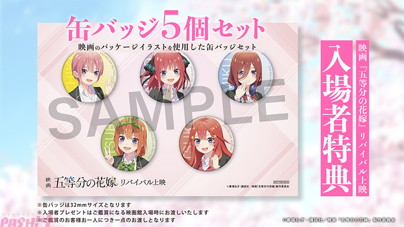 また、『五等分の花嫁*』の公開を記念して、映画『五等分の花嫁』のリバイバル上映も決定。日程は9月10日(火)19時より、新宿バルト9、T・ジョイ梅田、T・ジョイ博多、ユナイテッド・シネマ札幌、109シネマズ名古屋の全国5箇所の劇場で実施されます。入場者特典として、映画『五等分の花嫁』のパッケージイラストを使用した缶バッジ5個セットを配布予定。1日限りの特別な上映会となります。