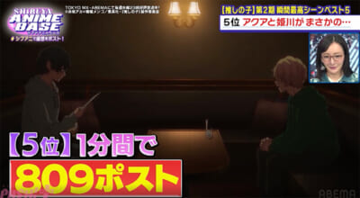 見事第5位に輝いた第20話のアクアと姫川の父親が同じだと判明するシーンは1分間で809ポストを記録。視聴者のポストも紹介となり、意外な展開に「ラスト10秒で全部の感情ひっくり返されたわ」とのポストが公開されます。