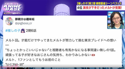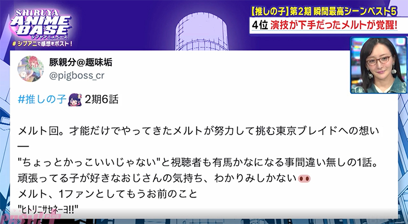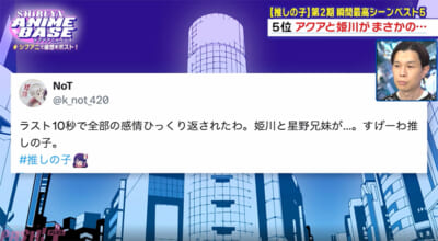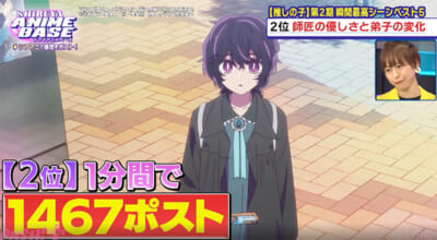 本放送では最終回目前のアニメ『【推しの子】』第2期を振り返り! リアルタイム勢のXのポスト数と瞬間最新シーンベスト5が発表されました。
