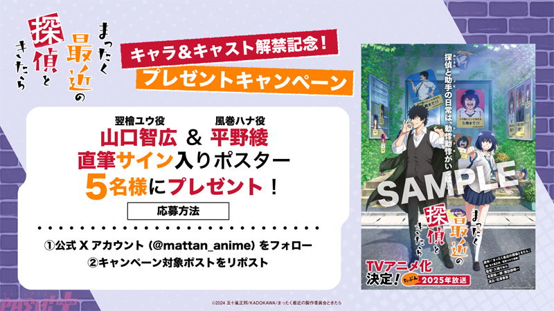 また、新キャラ&キャスト解禁を記念し、山口智広さん(翌檜ユウ役)&平野綾さん(風巻ハナ役)直筆サイン入りのティザービジュアルを使用したポスターのプレゼントキャンペーンが実施中です。TVアニメ『まったく最近の探偵ときたら』公式X(旧Twitter)をフォローして、プレゼントキャンペーン対象ポストをリポストすることで参加できます。