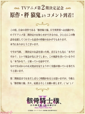 『骸骨騎士様、只今異世界へお出掛け中』TVアニメ第2期が制作決定! 原作&イラストレーター 記念コメント&直筆イラスト色紙も到着