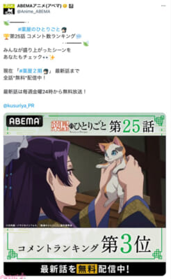 ABEMAは、ABEMAアニメチャンネル公式X(旧Twitter)にて『薬屋のひとりごと』第25話(第2期 第1話)「猫猫と毛毛」放送時のコメント最多シーンTOP3を発表しました。