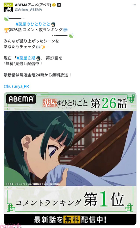 ABEMAは、ABEMAアニメチャンネル公式X(旧Twitter)にて『薬屋のひとりごと』第26話(第2期 第2話)「隊商」放送時のコメント最多シーンTOP3を発表しました。