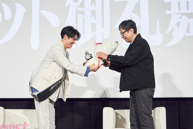 そして、ここでサプライズ。2月2日は鶴巻監督のお誕生日ということで、土屋さんから「お誕生日おめでとうございます、とガンダムが言っている」という言葉と共に、鶴巻監督に花束が贈呈された。会場からの拍手に加え、年齢を問われた鶴巻監督は、「17 歳と言っておこうかな(笑)」と、少し恥ずかしそうに応えていた。
