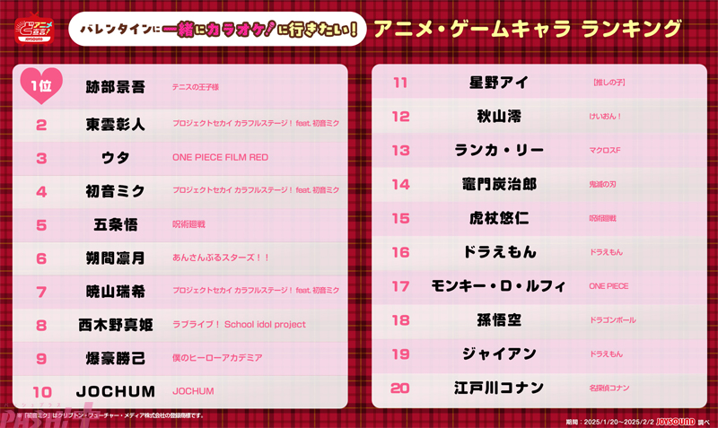 【バレンタイン】『テニスの王子様』の跡部景吾が堂々の1位、『プロセカ』からは東雲彰人や暁山瑞希もランクイン! 「バレンタインに一緒にカラオケに行きたい!アニメ・ゲームキャラ」ランキングが発表