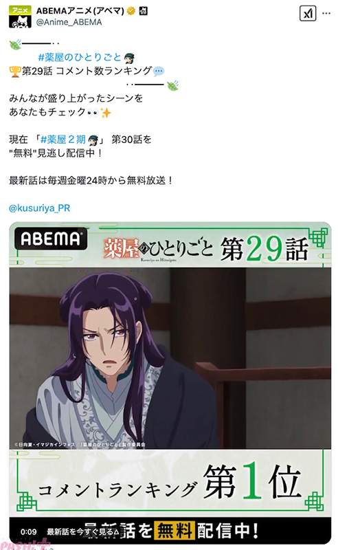 ABEMAは、ABEMAアニメチャンネル公式X(旧Twitter)にて『薬屋のひとりごと』第29話(第2期 第5話)「月精」放送時のコメント最多シーンTOP3を発表しました。