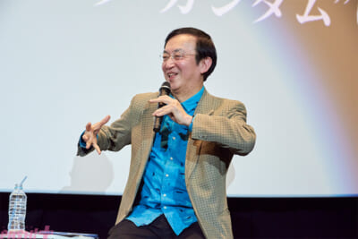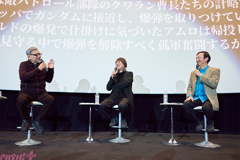 「『ジークアクス』は、“聞いてないよ!”、“どういうこと?”、“どこまで行くの?”の三段活用」と、その冒頭部分について氷川は説明。さらに話は、『ジークアクス』の舞台であるイズマ・コロニーについても。出渕から作品に「日本語表記」が出てくることを問われ、庵野の視点から解説が行われるなど、本編の内容についても触れられたのち、トークショーは終了となった。