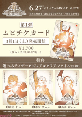 ティザービジュアルを使用した第1弾ムビチケカードが、全国の上映劇場(一部劇場を除く)と通販にて明日 3月1日(土)より発売開始となります(通販は0:00より、劇場はOPEN時より発売開始)。ムビチケカード購入特典にはティザービジュアル・ソロビジュアルを使用したA5サイズの「選べるティザービジュアルクリアファイル」(全3種)が付属。またムビチケオンライン券では第1弾オリジナルスマホ壁紙(4種)が入手できます。
