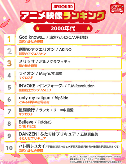 「残酷な天使のテーゼ」が1位を獲得!本楽曲は2024年の年間ランキングにおいても、10代~60代の全年代のTOP10入りを果たしており、世代を超えて愛される超鉄板ソングとなっています。また、ガンダム作品が5曲を占めるなか、女性支持の厚い『美少女戦士セーラームーン』、1990年代後半の『ONE PIECE』の主題歌など、若い世代にも馴染みの深い曲も見られました。