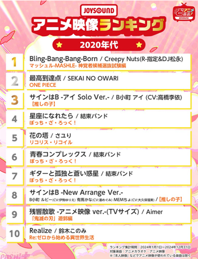 独特のダンスと一度聴いたら耳から離れない中毒性で2024年に大ブームとなったTVアニメ『マッシュル-MASHLE- 神覚者候補選抜試験編』OPテーマ「Bling-Bang-Bang-Born」が幅広い年代から支持を獲得し首位に!アイドルの活動を描いた作品『【推しの子】』から2曲、ガールズバンドをテーマとした作品『ぼっち・ざ・ろっく!』からは3曲ランクインするなど、音楽系アニメとカラオケの相性の良さも伺える結果となりました。