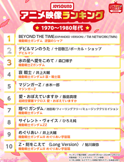 首位のTM NETWORK(TMN)『BEYOND THE TIME』を筆頭に、TOP10のうち7曲を『機動戦士ガンダム』シリーズの関連曲が占める結果に!このほか、「デビルマンのうた」や「マジンガーZ」といったアニメソングの王道、『超時空要塞マクロス 愛・おぼえていますか』など、今も根強いファンを誇る名作アニメの関連曲がランクインしました。