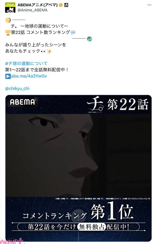 「ABEMA」は、2月23日(日)に放送された『チ。 ―地球の運動について―』第22話「君らは歴史の登場人物じゃない」より、視聴者からのコメントを多く集めたシーンを独自調査。「『チ。 ―地球の運動について―』第22話コメント最多シーンTOP3」としてABEMAアニメチャンネル公式Xにて公開しました。