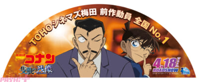 看板が設置されるのはTOHO シネマズ梅田の本館8F、コンセッション(飲食売店)の上にある横8.8m×縦3.3mの巨大半円型のスペース。本作で、普段の様子とは違ったクールな表情を見せる小五郎の「この事件、俺が必ず終わらせる」と強い決意をもって事件解決に挑む様子が伝わるビジュアルとなっています。そして、前作の「動員 No.1」とも、“内緒ポーズ”ともとれる人差し指を口に当てたポーズで、片目を閉じてお茶目に、小五郎の背後に回るコナン。その仕草や表情からは、この看板を目にするお客様に向けた「クールな小五郎を静かに見守ってあげて」というような声が聞こえてきそうです……!