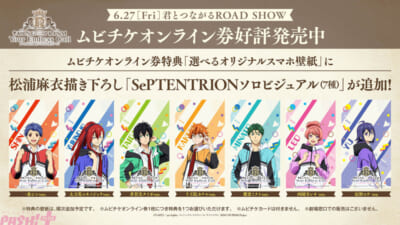 今回描き下ろされたキャラクタービジュアルは各々がメンバーカラーのジャージを身に纏ったカジュアルな姿で登場。現在発売中のムビチケオンライン券を購入するともらえるオリジナルスマホ壁紙に、SePTENTRION ソロビジュアルを使用した絵柄7種が本日から新たに追加となります。