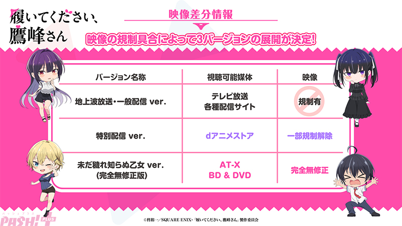 アニメ『履いてください、鷹峰さん』は「地上波放送・一般配信 ver.」「トップレスの特別配信 ver.」「未だ穢れ知らぬ乙女 Ver.」の3つの映像規制で展開! 最新ビジュアルも公開
