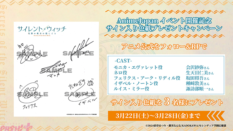 3月22日開催のTVアニメ『サイレント・ウィッチ 沈黙の魔女の隠しごと』~沈黙の魔女の潜入捜査会議~は今後1週間アニプレックスYouTubeチャンネルにて限定アーカイブ配信が行われます。まだご覧になられていない方はぜひアーカイブ配信期間中に豪華キャスト陣によるステージをご視聴ください。