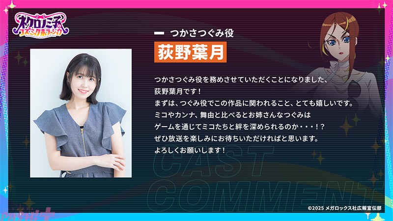 つかさつぐみ役を務めさせていただくことになりました、荻野葉月です! まずは、つぐみ役でこの作品に関われること、とても嬉しいです。