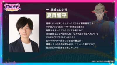 鷹城ヒロシを演じさせていただきます夏目響平です! ネクロノミ子はストーリーが本当に面白く毎話台本をいただくのがとても楽しみで、次の話はどんな内容なんだ!? この先どうなるんだい!? とドキドキワクワクしていました!
