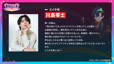 僕が演じる役はプロゲーマーの『エイタ』……声を出してみると驚くほど自然にハマる役。僕の尖ったオリジナリティを存分に詰め込んだ『エイタ』になっています。どうぞお楽しみに!