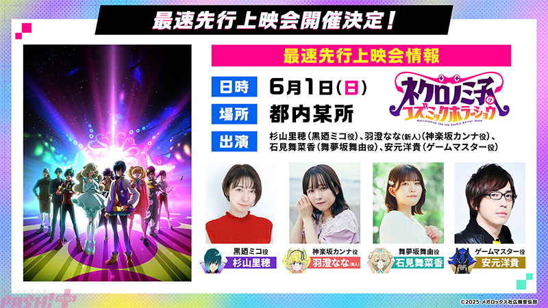 2025年7月からの放送開始に先駆けて、「ネクロノミ子のコズミックホラーショウ」の最速先行上映会が決定! トークショー内でも最新情報と新キャラクターの解禁を予定しています。