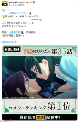 ABEMAは、ABEMAアニメチャンネル公式X(旧Twitter)にて『薬屋のひとりごと』第35話「狩り」(第2期 第11話)放送時のコメント最多シーンTOP3を発表しました。