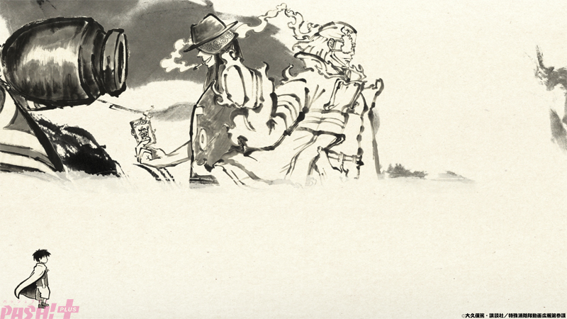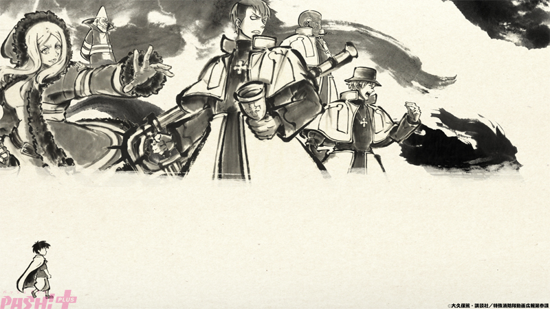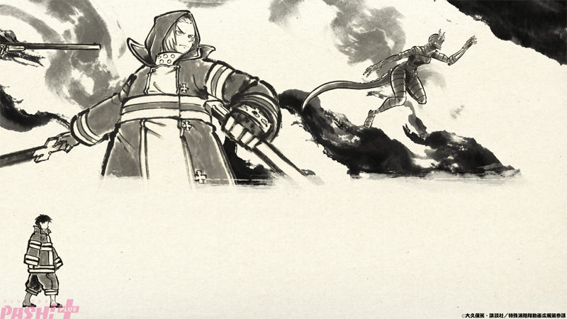 水墨画風に描かれた壱話エンディング映像では、梅田サイファーが歌うエンディングテーマ『ウルサイレン』にのせて、画面の下半分では歩を進めながら成長していくシンラの姿が、上半分では世界を守ってきた特殊消防官たちの姿が描かれています。