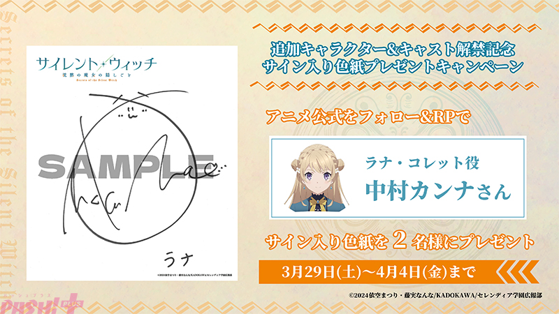 アニメ公式X(旧Twitter)ではラナのキャラクターイラスト及びキャラプロフィールが公開され、それに伴い公式サイトも更新されました。また、今回のキャラクター解禁を記念してラナ役:中村カンナのサイン入り色紙が当たる公式Xフォロー&リポストキャンペーンも実施されます。