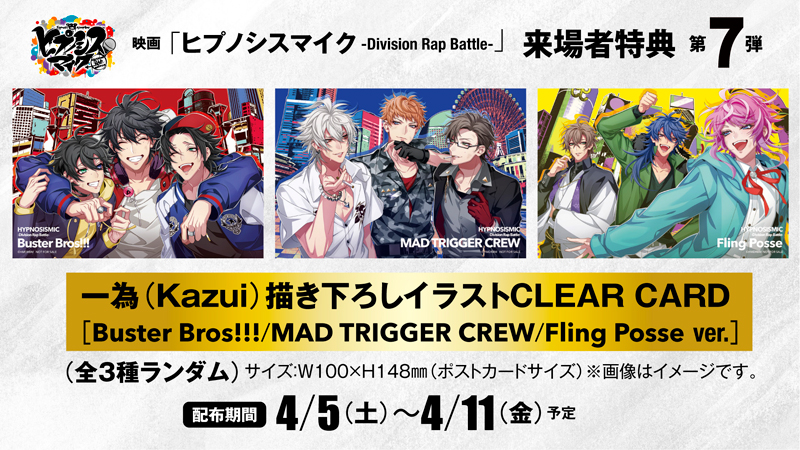 まだまだ映画館で快進撃を続けるヒプムビは、毎週変わる来場者特典も見逃せません。4月11日(金)までは来場者特典第7弾として、ヒプノシスマイクのキャラクターデザインを務める一為(Kazui)が描き下ろした、「一為(Kazui)描き下ろしイラストCLEAR CARD [Buster Bros!!!/MAD TRIGGER CREW/Fling Posse ver.](全3種ランダム)」を配布中。来場者特典でしか手に入らない貴重なプレゼントとなります。