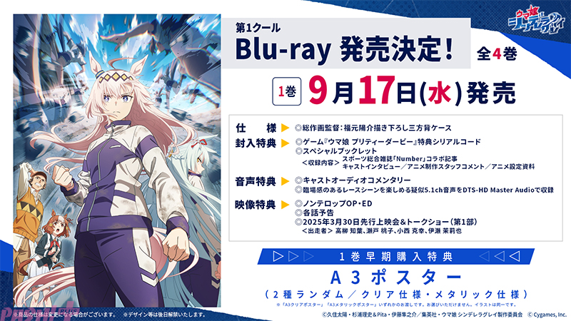 第1クールのBlu-rayが全4巻で発売決定しました。三方背ケースは総作画監督:福元陽介さん描き下ろし。さらに封入特典にはゲームアイテムと交換できるシリアルコードや内容盛りだくさんのスペシャルブックレットのほか、臨場感のあるレースシーンを楽しめる疑似5.1ch音声などの豪華特典が満載です。あわせて、店舗別特典も解禁されました。